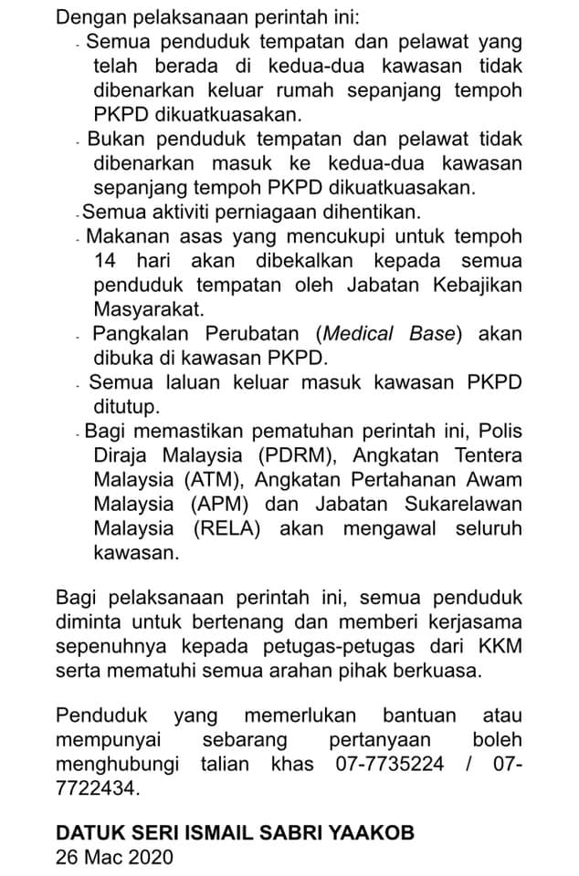 Semua laluan keluar masuk kawasan PKPD ditutup dan dikawal rapat oleh Polis Diraja Malaysia (PDRM), Angkatan Tentera Malaysia , Angkatan Pertahanan Awam Malaysia, dan RELA akan mengawal seluruh kawasan tersebut. – The Capital Post