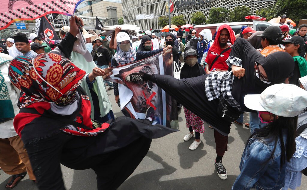 The demonstrators gathered around the French embassy in Jakarta with the city recording high positive cases.