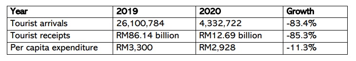 Malaysia’s tourist receipts plunged by 85.3% from RM86.14 billion in 2019 to RM12.69 billion in 2020, with the average per capita expenditure recorded a total of RM2,928, a decline of 11.3% from RM3,300 in 2019.