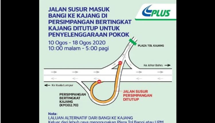 KUALA LUMPUR: PLUS Malaysia Berhad (PLUS) akan menutup jalan susur masuk Bangi ke Kajang untuk semua kenderaan jam 10 malam hingga 5 pagi, mulai 10 hingga 18 Ogos ini.