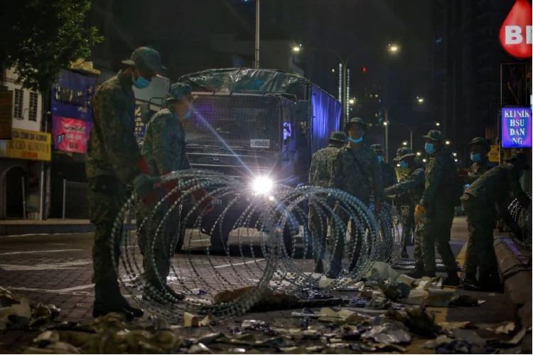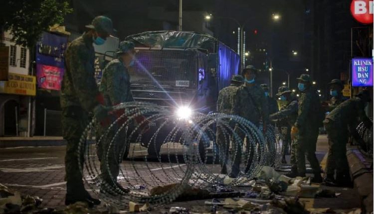Dalam gerakan itu, anggota tentera dilihat memasang kawat duri bagi mengelilingi kawasan bangunan kediaman dan premis perniagaan sekitar kawasan terbabit.