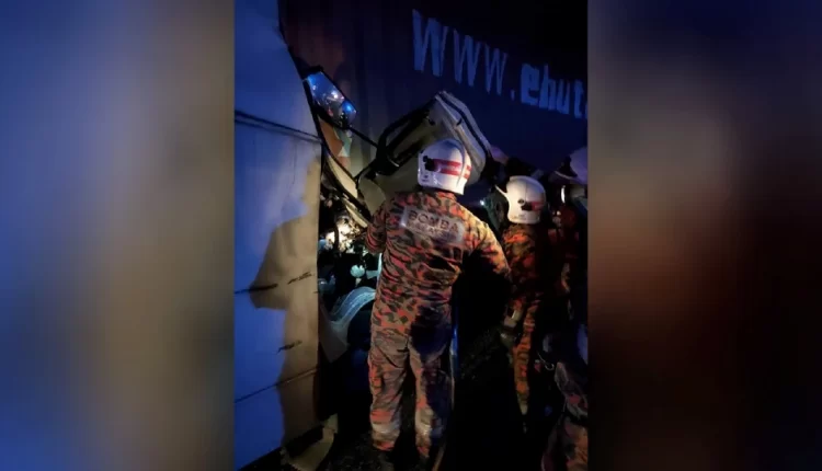 GOPENG: Dua kelindan lori warga Bangladesh maut apabila lori dinaiki melanggar belakang sebuah treler di KM 307.5 Lebuhraya Utara Selatan (PLUS) arah selatan di sini, hari ini.