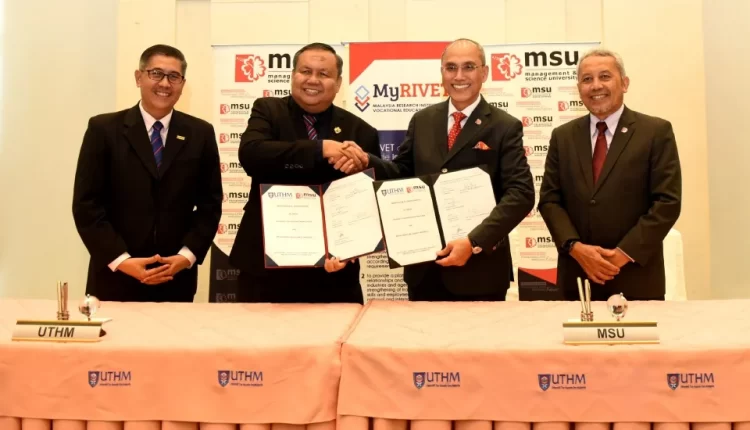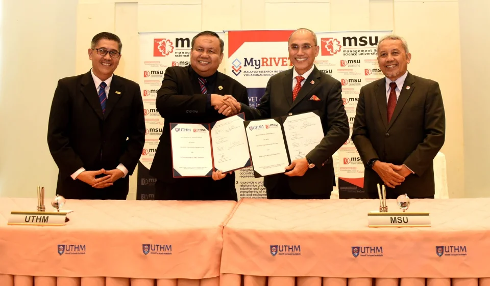 KUALA LUMPUR: Management and Science University (MSU) dan Universiti Tun Hussein Onn Malaysia (UTHM) telah memeterai Memorandum Persefahaman (MoU) bagi memperkasakan bidang Pendidikan Latihan Teknikal dan Vokasional (TVET) dan penyelidikan.