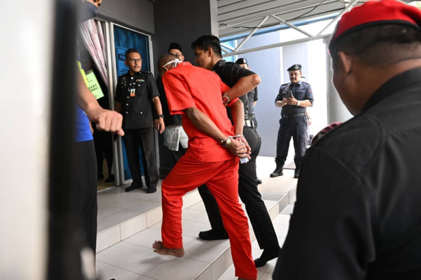 Sebaik tiba, tertuduh yang memakai pakaian lokap berwarna oren dan pelitup muka dengan tangan bergari masuk ke masjid berkenaan diiring anggota polis.