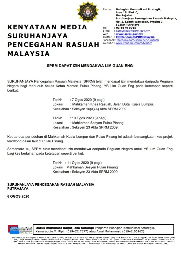 Kenyataan Media SPRM berkaitan penahanan YB Lim Guan Eng pada 6 Ogos 2020