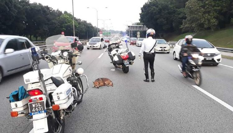 KUALA LUMPUR: A Shah Alam traffic police officer is getting praise from Netizens for rescuing a dog that had just been hit by a car at KM13.8 of the Federal Highway this morning.