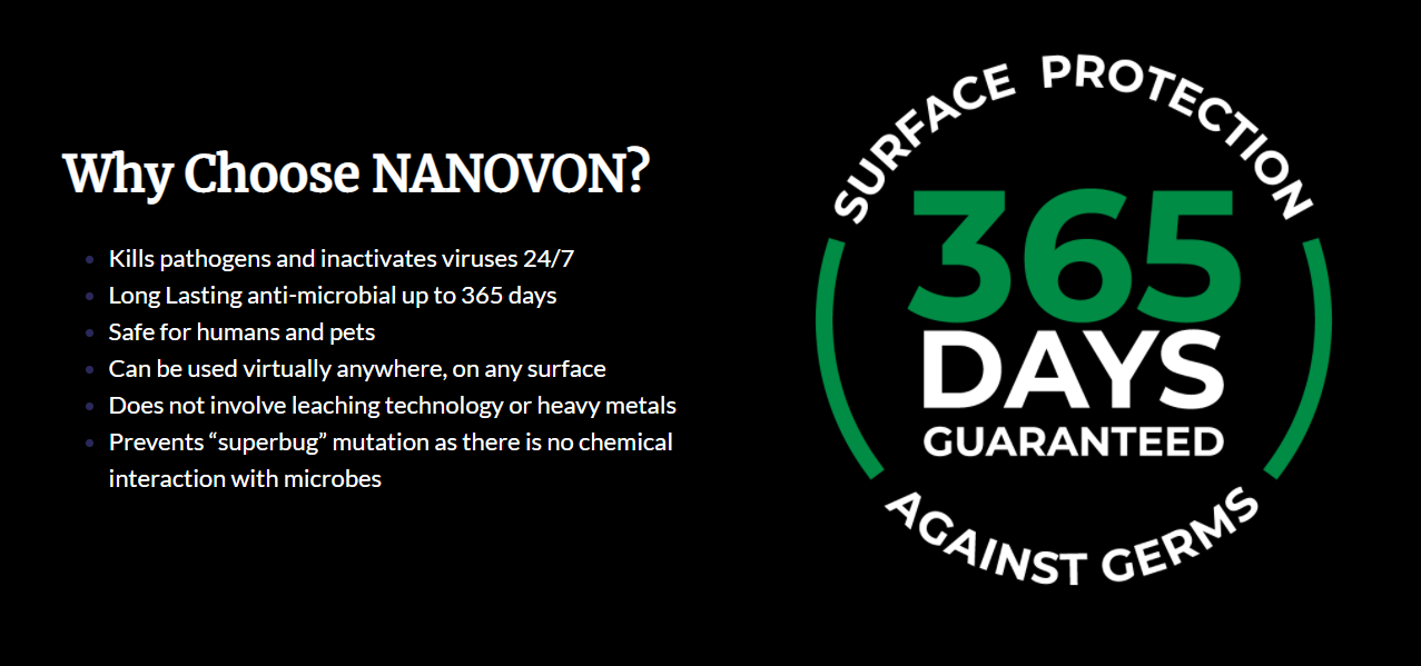 Unlike disinfectant products which only kill pathogens for a short period of time, Nanovon™️ has been proven to have a lasting effect up to 365 days on surfaces with an unprecedented 30-seconds kill time.