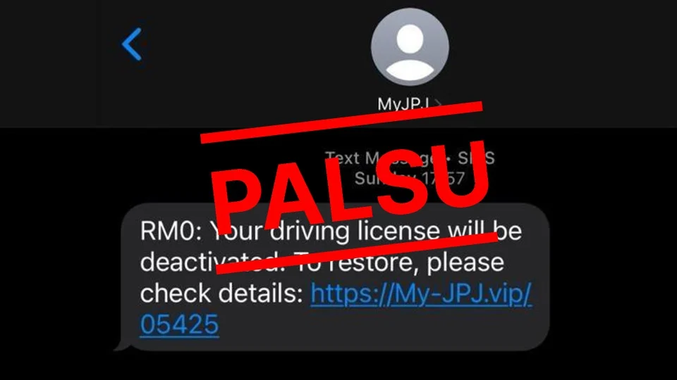 Sementara itu, SMS palsu yang dihantar kononnya dari MyJPJ itu mengandungi pesanan dalam bahasa Inggeris meminta penerima membuka pautan yang disertakan sekiranya tidak mahu lesen memandu mereka dinyahaktifkan atau dibatalkan.
